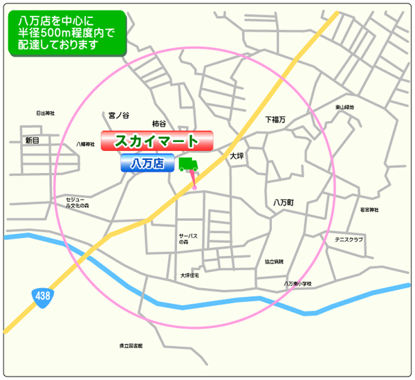 配達エリア DELIVERY AREA 配達エリアと配達時間について 現在は、試験的にスタートさせておりますので配達は、八万店だけとなっております。配達エリアは、店舗を中心に半径約500m以内とさせて頂いております。配達時間につきましては、店員とご相談ください。高齢者だけでなく、妊婦さんや子育てに追われる方のためにも配達業務は承ります。